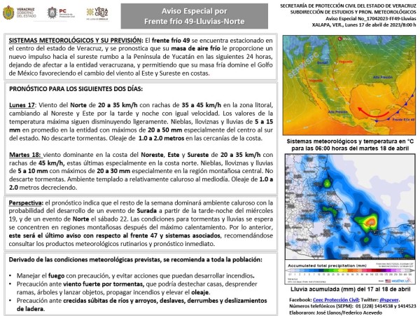 Población veracruzana: Aviso Especial por Surada-Frente frío-Lluvias-Norte