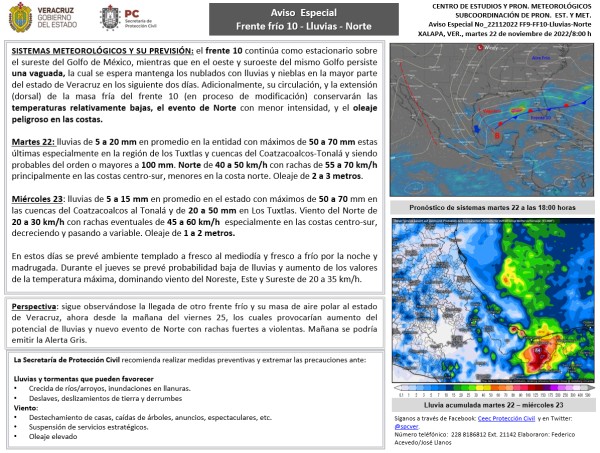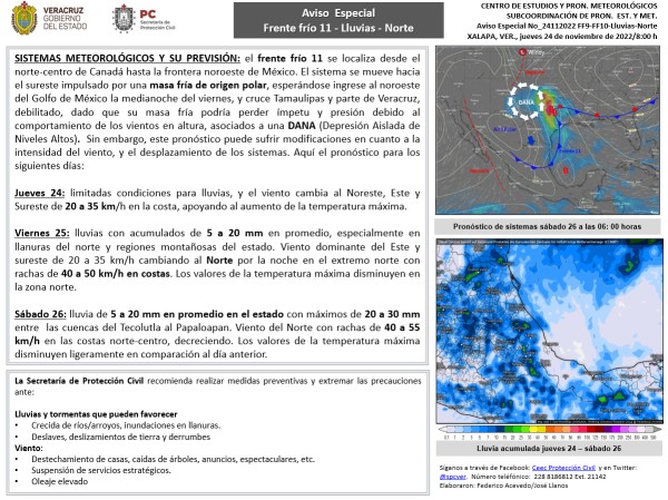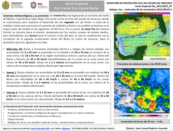 Población veracruzana: Aviso Especial por frente frío-Lluvia-Norte