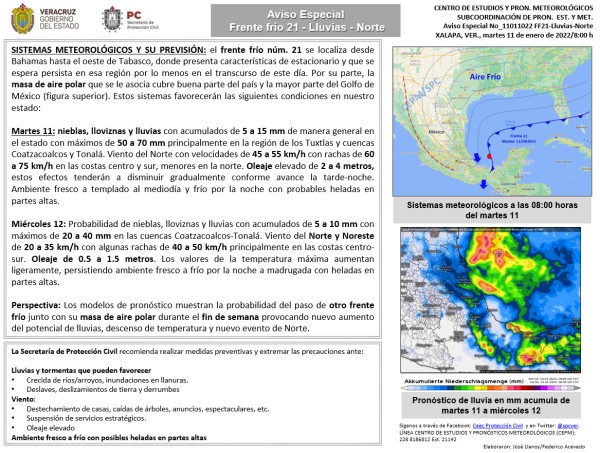 Población veracruzana: Aviso Especial con frente frío-Lluvia-Norte