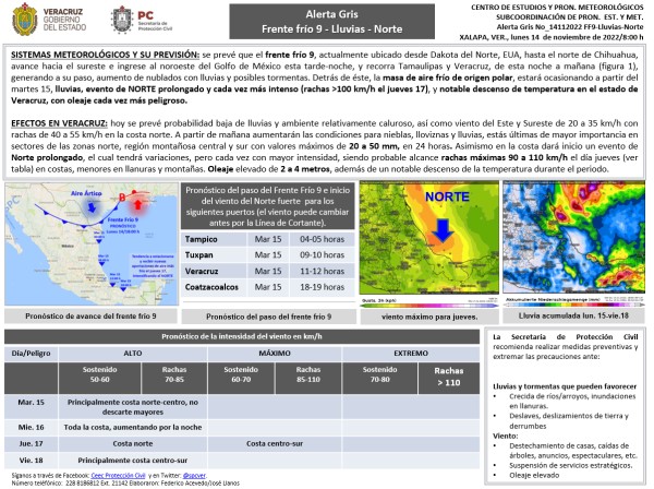 De nuevo Alerta Gris para Veracruz por Frente frío-lluvia y Norte que viene desde Canadá.