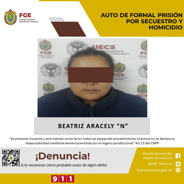 Dicta Juez auto de formal prisión por secuestro y homicidio en contra de Beatriz Aracely ‘N’ por secuestro y homicidio.
