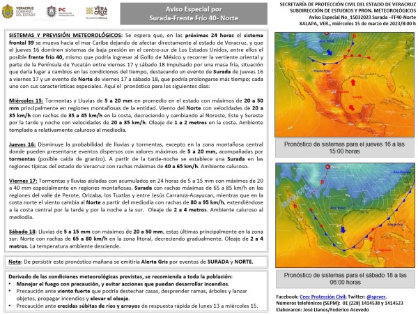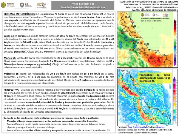Población veracruzana: Aviso Especial por Surada-Frente frío-Lluvias-Norte