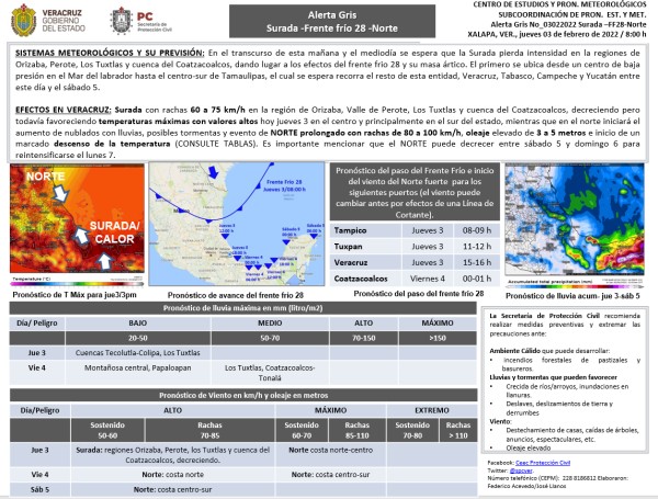 Alerta Gris por Frente frío 28-Lluvia, Norte-Surada