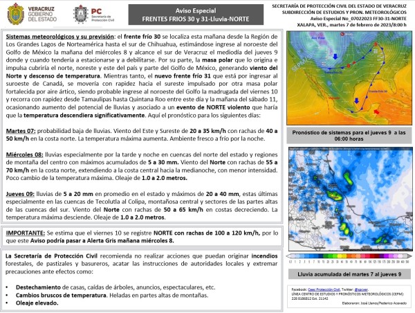 Población veracruzana: se desactiva #AlertaGris, se emite #AvisoEspecial por Frente frío-Norte