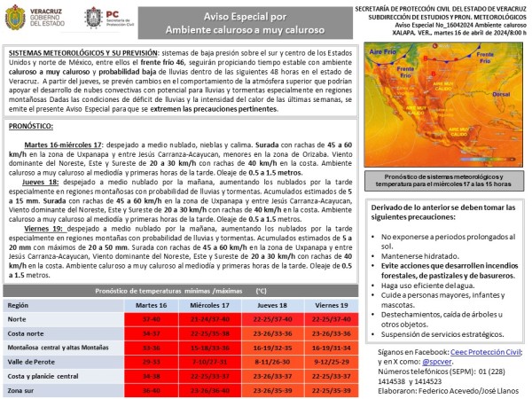 Población veracruzana: #AvisoEspecial por Surada-Ambiente Caluroso-Frente frío-Norte
