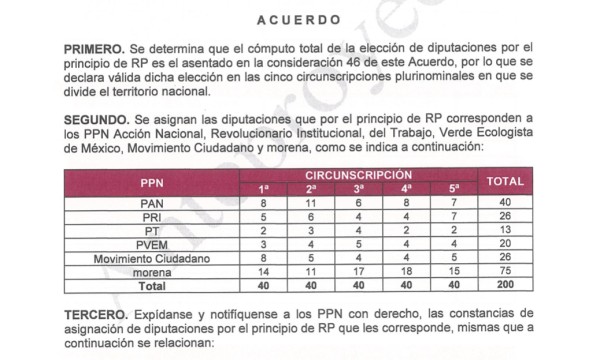 | .- De acuerdo con el “Anteproyecto de Acuerdo para la asignación de Diputaciones de Representación Proporcional del Consejo General del INE", el tema de los diputados federales plurinominales quedaría así: Morena 75; el PT, 13; el Verde, 20; el PAN, 40; al PRI, 26; y al MC 26.