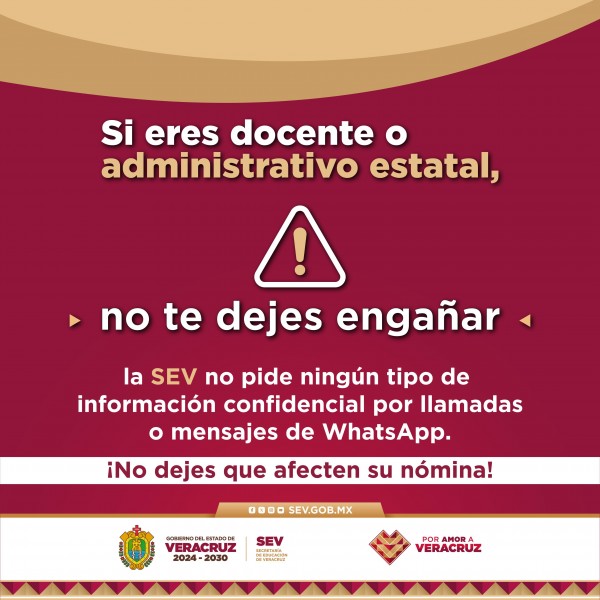 Cuando menos, la Secretaría de Educación de Veracruz ha lanzado un anuncio al magisterio para que no se dejen engañar con llamadas o mensajes de WhatsApp. Lo anterior, derivado de varios reportes.