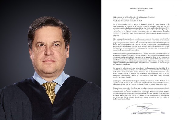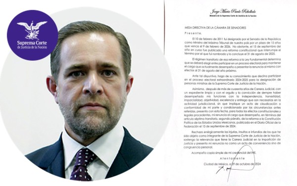 | .- Con una renuncia más ácida que la que presentó el Ministro Ortiz Mena, Jorge Mario Pardo Rebolledo presentó también la suya como Ministro de la Suprema Corte de Justicia de la Nación, efectiva al 31 de agosto de 2025.