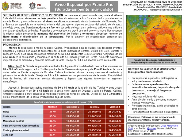 | .- SISTEMAS METEOROLÓGICOS Y SU PREVISIÓN: se mantiene el pronóstico de que, hasta el sábado 5 de abril dominen sistemas de baja presión sobre el centro-sur de los Estados Unidos y norte-centro-este de México y se combinen con el viento en altura, ocasionando viento dominante del Suroeste, Sur y Sureste en superficie en la vertiente orient... |