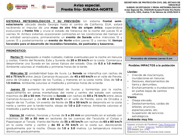 | .- SISTEMAS METEOROLÓGICOS Y SU PREVISIÓN: Un sistema frontal semi-estacionario ubicado desde Georgia hasta el centro de California. EUA, estará recibiendo el impulso de una masa de aire frío de origen ártico, esperándose evolucione a frente frío y cruce el estado de Veracruz de la noche del jueves 13 al viernes 14. Ambos sistemas o... |
