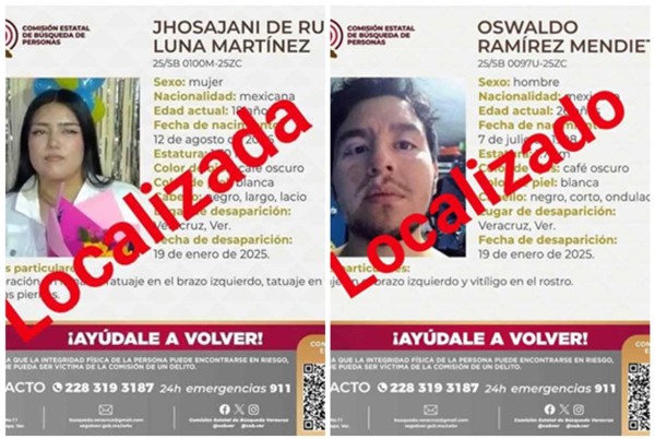 | .- Cortesía del periodista Irineo Pérez Melo.- Los jóvenes Jhoshajani de Rubí Luna Martínez y Oswaldo Ramírez Mendieta, reportados como desaparecidos el pasado 19 de enero del año en curso en el puerto de Veracruz, fueron localizados con vida confirmaron sus familiares este jueves.De acuerdo con la información proporcionada, ... |