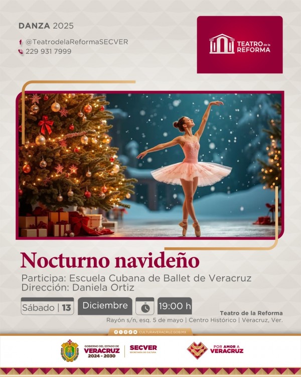 | .- Xalapa, Ver., miércoles 10 de diciembre de 2025.- La Secretaría de Cultura de Veracruz (SECVER) invita al espectáculo de danza Nocturno Navideño, a cargo de la Escuela Cubana de Ballet de Veracruz (Escubaver), el sábado 13 de diciembre a las 19:00 horas en la Sala Principal del Teatro de la Reforma, en el puerto de Veracruz. La entrada es libr... |