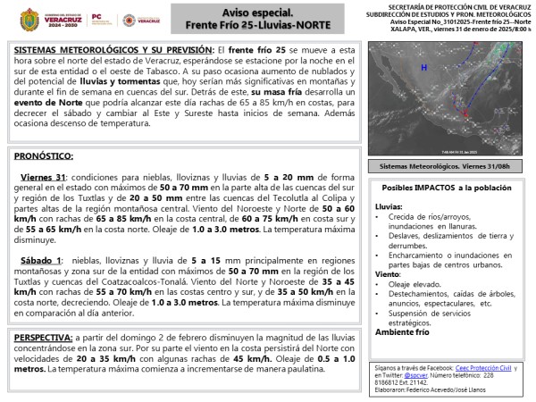 | .- SISTEMAS METEOROLÓGICOS Y SU PREVISIÓN: El frente frío 25 se mueve a esta hora sobre el norte del estado de Veracruz, esperándose se estacione por la noche en el sur de esta entidad o el oeste de Tabasco. A su paso ocasiona aumento de nublados y del potencial de lluvias y tormentas que, hoy serían más significativas en montañas y... |