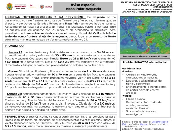 | .- SISTEMAS METEOROLÓGICOS Y SU PREVISIÓN: La masa de aire polar se desborda sobre el noreste y este de México, teniendo como frontera el eje de la vaguada ubicada en el oeste del Golfo de México. Tal situación aumenta las condiciones para lluvias, genera nuevo descenso de temperatura y desarrolla evento de Norte fuerte a violento en costas... |