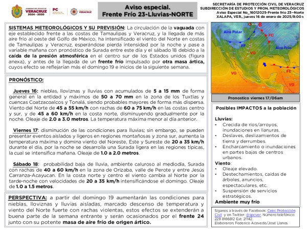 | .- SISTEMAS METEOROLÓGICOS Y SU PREVISIÓN: La circulación de la vaguada con eje establecido frente a las costas de Tamaulipas y Veracruz, y la llegada de más aire frío al oeste del Golfo de México, ha intensificado el viento del Norte en costas de Tamaulipas y Veracruz, esperándose pierda intensidad por la noche y pase a variable ma... |
