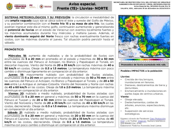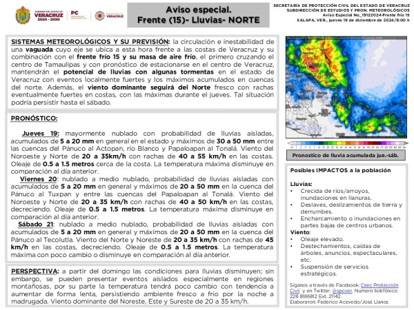 | .- SISTEMAS METEOROLÓGICOS Y SU PREVISIÓN: la circulación e inestabilidad de una vaguada cuyo eje se ubica a esta hora frente a las costas de Veracruz y su combinación con el frente frío 15 y su masa de aire frío, el primero cruzando el centro de Tamaulipas y con pronóstico de estacionarse en el centro de Veracruz, mantendrán... |