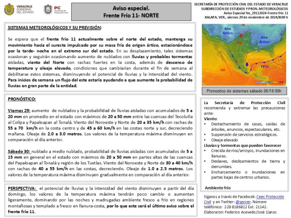 Se espera que el frente frío 11 actualmente sobre el norte del estado, mantenga su movimiento hacia el sureste impulsado por su masa fría de origen ártico, estacionándose por la tarde- noche en el extremo sur del estado. En su desplazamiento, tales sistemas ocasionan y seguirán ocasionando... |