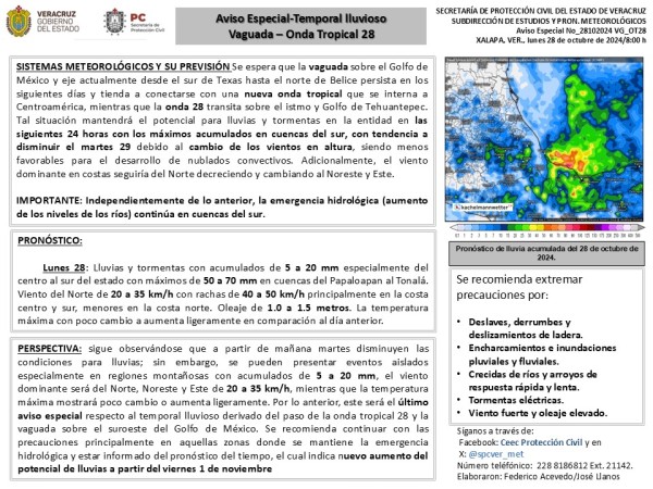 | .- SISTEMAS METEOROLÓGICOS Y SU PREVISIÓN Se espera que la vaguada sobre el Golfo de México y eje actualmente desde el sur de Texas hasta el norte de Belice persista en los siguientes días y tienda a conectarse con una nueva onda tropical que se interna a Centroamérica, mientras que la onda 28 transita sobre el istmo y Golfo de Tehuantepec. Tal s... |