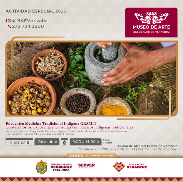 | .- Xalapa, Ver., jueves 04 de diciembre de 2025.- La Secretaría de Cultura de Veracruz (SECVER) invita al Encuentro de Medicina Tradicional Indígena de las Altas Montañas, que se llevará a cabo este viernes 5 de diciembre, de 09:00 a 14:00 horas, en el Museo de Arte del Estado de Veracruz (MAEV), en colaboración con el Consejo Regional de M&eacut... |