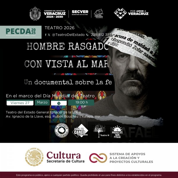 | .- Xalapa, Ver., viernes 27 de marzo de 2026.- La Secretaría de Cultura de Veracruz (SECVER), en coordinación con el Programa de Estímulos a la Creación y Desarrollo Artístico (PECDA) del Sistema de Apoyos a la Creación y Proyectos Culturales, invita a la obra escénica Hombre rasgado con vista al mar, en el marco del Día Mund... |