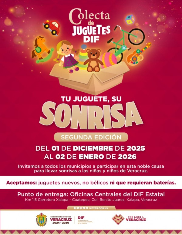 | .- Xalapa, Ver., martes 02 de diciembre de 2025.- El Sistema Estatal para el Desarrollo Integral de la Familia (DIF) invita a instituciones, empresas y familias veracruzanas a sumarse a la colecta Tu Juguete, Su Sonrisa, una iniciativa que busca llevar alegría, esperanza e inspiración a niñas y niños que viven en condiciones de alta vulnerabilidad.