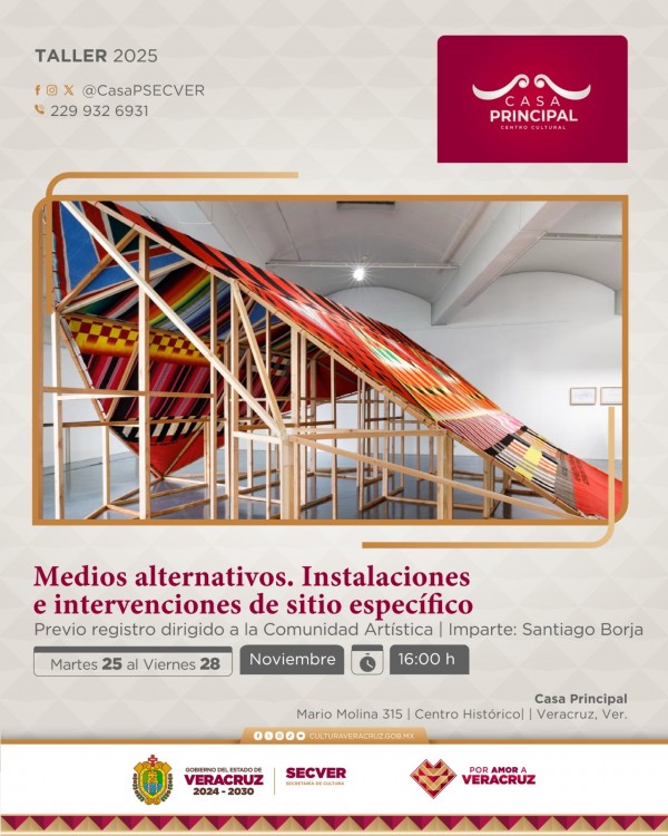 | .- Xalapa, Ver., sábado 22 de noviembre de 2025.-La Secretaría de Cultura de Veracruz (SECVER) invita al público interesado en el arte contemporáneo a participar en el taller teórico-práctico Medios Alternativos. Instalaciones e intervenciones de sitio específico, que se realizará del 25 al 28 de noviembre, en horario de 17:0... |