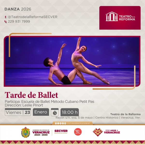 | .- Xalapa, Ver., jueves 22 de enero de 2026.- La Secretaría de Cultura de Veracruz (SECVER) invita a asistir al recital de danza Tarde de Ballet, de la Escuela de Ballet Método Cubano Petit Pas, a presentarse este viernes a las 18:00 horas, en la Sala Principal del Teatro de la Reforma, en el puerto de Veracruz. La entrada es libre.