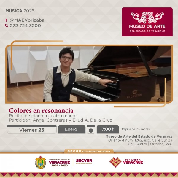| .- Xalapa, Ver., jueves 22 de enero de 2026.- La Secretaría de Cultura de Veracruz invita al recital de piano Colores en resonancia, este viernes a las 17:00 horas, en el Museo de Arte del Estado de Veracruz (MAEV) ubicado en Orizaba. La entrada es libre.