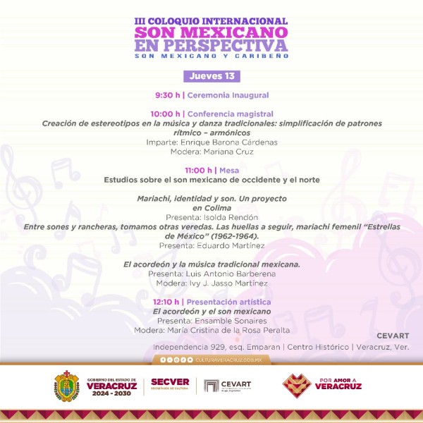| .- Xalapa, Ver., jueves 13 de noviembre de 2025.- La Secretaría de Cultura de Veracruz (SECVER) invita al público a participar en las actividades del III Coloquio Internacional Son mexicano en Perspectiva, que se desarrollan en el Centro Veracruzano de las Artes (CEVART) Hugo Argüelles, en el puerto de Veracruz.