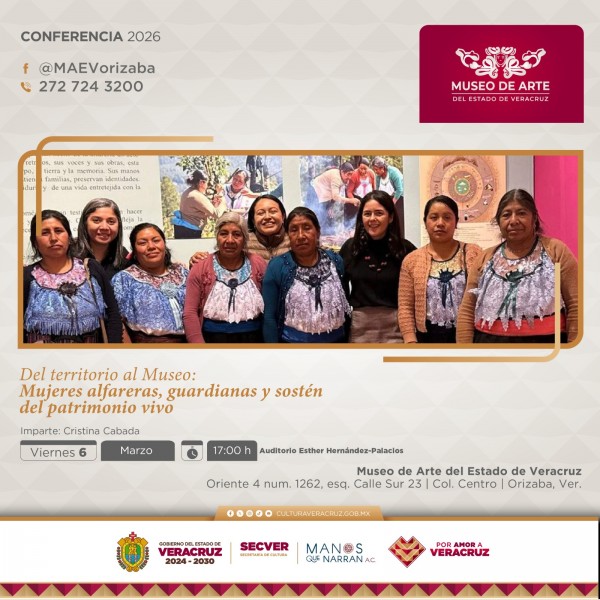 | .- Xalapa, Ver., jueves 05 de marzo de 2026.- En el marco de la conmemoración del Día Internacional de la Mujer, la Secretaría de Cultura de Veracruz (SECVER) invita a la conferencia Del territorio al museo: mujeres alfareras, guardianas y sostén del patrimonio vivo, el viernes 06 de marzo a las 17:00 horas en el Museo de Arte del Estado de Veracruz (MA... |