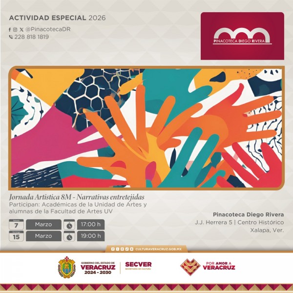| .- Xalapa, Ver., jueves 05 de marzo de 2026.- La Secretaría de Cultura de Veracruz (SECVER) en colaboración con la Unidad de Artes de la Universidad Veracruzana (UV), invita al público a la Jornada Artística 8M: Narrativas entretejidas, que se llevarán a cabo el sábado 07 y domingo 15 de marzo, a las 17:00 horas y 19:00, respectivamente, e... |