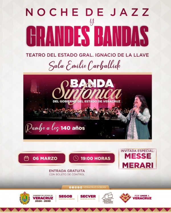 | .- Xalapa, Ver., miércoles 04 de marzo de 2026.- La Secretaría de Cultura de Veracruz (SECVER), en colaboración con la Coordinación de Valores Cívicos y Culturales de la Secretaría de Gobierno, invita al Concierto Noche de Jazz y Grandes Bandas, a cargo de la Banda Sinfónica del Gobierno del Estado de Veracruz, el viernes 06 de marz... |