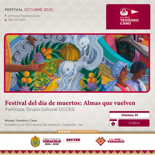 | .- Xalapa, Ver., miércoles 29 de octubre de 2025.- La Secretaría de Cultura de Veracruz (SECVER) invita al público a disfrutar de las actividades de Día de Muertos, que se realizarán el próximo viernes 31 y sábado 01 de noviembre en el auditorio del Museo Teodoro Cano en Papantla. La entrada es gratuita.