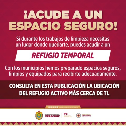 | .- Guadalupe Osorno, titular de la Secretaría De Protección Civil Del Estado de Veracruz informa que:Si vives en alguno de los municipios afectados en el Norte del Estado, y necesitas un lugar seguro para quedarte mientras se realizan los trabajos de limpieza y recuperación, puedes acudir a un Refugio Temporal.