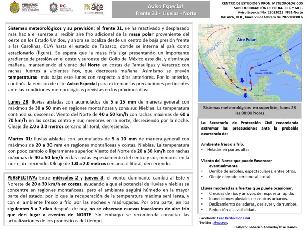 Sistemas meteorológicos y su previsión: el frente 31, se ha reactivado y desplazado más hacia el sureste al recibir aire frío adicional de la masa polar proveniente del oeste de los Estado Unidos, y ahora se localiza desde un centro de baja presión frente a las Carolinas, EUA hasta el estado de Tabasco, donde se interna al paí... |