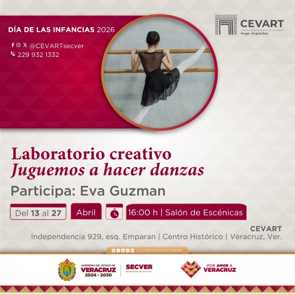 | .- Xalapa, Ver., martes 07 de abril de 2026.- La Secretaría de Cultura de Veracruz (SECVER) invita a la serie de laboratorios creativos y seminarios en torno a la danza, que se llevarán a cabo en el Centro Veracruzano de las Artes Hugo Argüelles (CEVART), en la ciudad de Veracruz, en el marco del Día Internacional de la Danza. La entrada es libre.