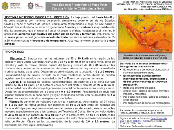 | #AvisoEspecial Frente Frío 42 - Masa Polar (Surada-Ambiente Cálido-Lluvia-Norte) |