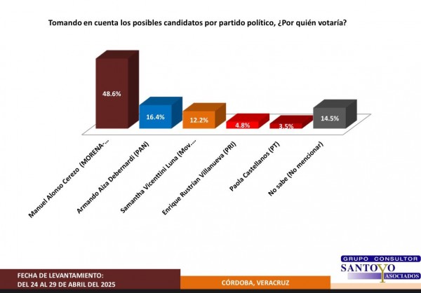 | .- Córdoba, Veracruz, 5 mayo de 2025.- De acuerdo con una encuesta levantada por el Grupo Consultor Santoyo, el candidato del partido Movimiento Regeneración Nacional (Morena), Manuel Alonso Cerezo, se perfila como el favorito en la contienda por la Presidencia Municipal de Córdoba, con una amplia ventaja sobre su más cercano contendiente.