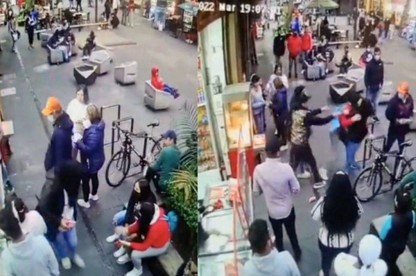 | .- Las cámaras de un negocio en las calles de la alcaldía Cuauhtémoc en la Ciudad de México captaron el momento en el que una mujer escupió y agredió a una pareja gay que supuestamente se habían dado un beso.