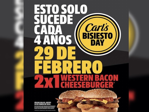 | .- El día de ayer, 29 de febrero, la cadena de comida rápida Carl's Jr. lanzó una promoción para conmemorar el año bisiesto, en la que los comenzales podían llevarse dos Western Bacon Cheeseburger y pagando solo una.