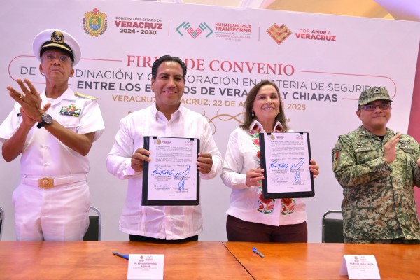 | .- Veracruz, Ver., viernes 22 de agosto de 2025.- La gobernadora Rocío Nahle García y su homólogo de Chiapas, Eduardo Ramírez Aguilar, signaron el Convenio de Coordinación y Colaboración en materia de Seguridad, con el propósito de reforzar las estrategias interestatales de prevención, vigilancia y atención ciudadana e... |