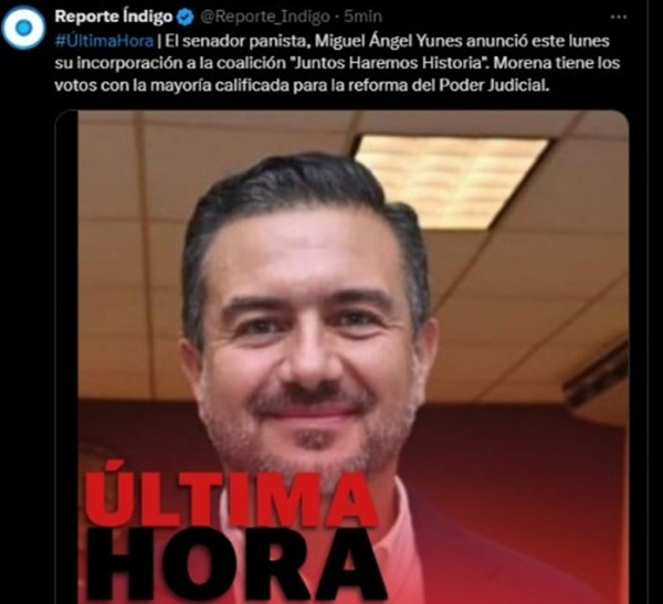 | .- “Conozco desde la cuna a @MYunesMarquez. Sé de su compromiso y lealtad con valores como la libertad, la justicia y la democracia. No tengo duda de que, en las próximas horas, se pronunciará para ratificar su posición respecto de la tóxica reforma judicial que impulsa el oficialismo...”.