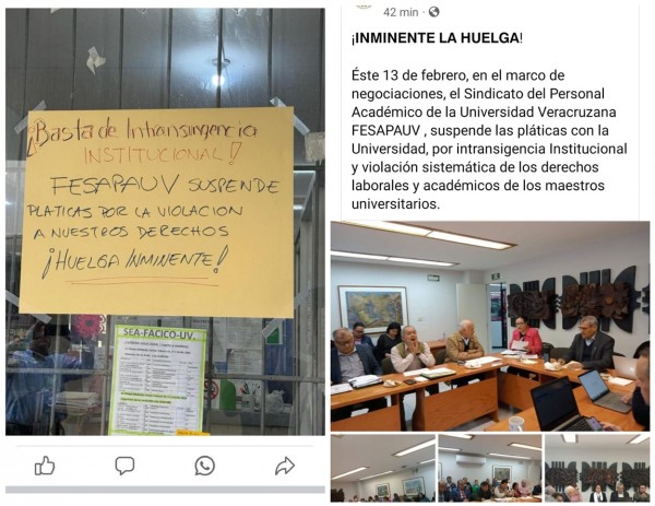 Ayer martes, en su cuenta de X -antes Twitter- dirigentes del Sindicato de Personal Académico de la Universidad Veracruzana (FESAPAUV) se da a conocer que este 13 de febrero del 2024, en el marco de las negociaciones con la Universidad Veracruzana, suspende las pláticas negociadoras por la intransigencia i... |